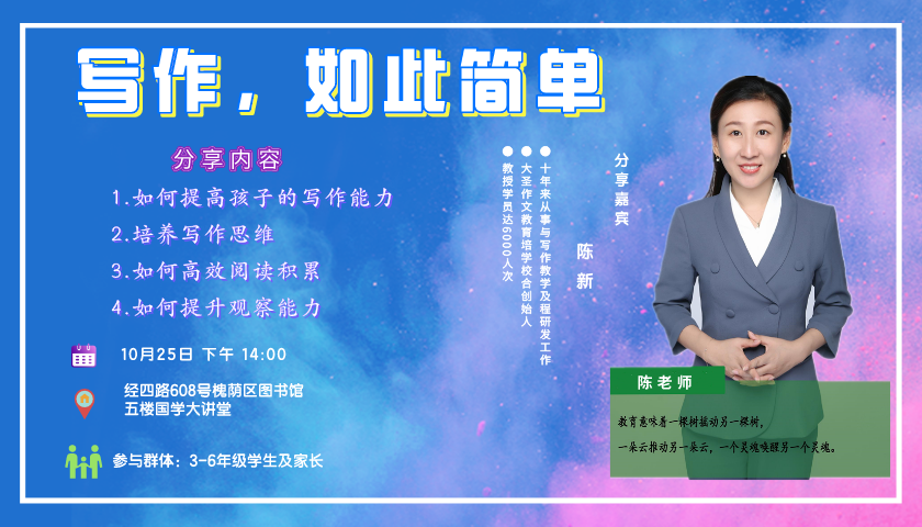 “一提写作直摇头,写了半天没看头”,这是太多孩子写作文的真实写照。为解决这些困惑,槐荫区图书馆特邀请陈老师带领小读者现场梳理写作思路,提升写作技巧,让写作变得简单。众所周知,写作是大量的阅读积累,是生活的观察与思考,是思维的创新,是技巧的运用,如何帮助孩子们走出写作的困境?提高孩子们的写作能力呢。