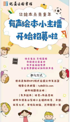 绘本阅读能够激发孩子的阅读兴趣、促进想象力的发展、培养创造能力。有声绘本阅读活动通过朗读绘本,记录美好生活,带领小读者发现美,分享阅读的快乐。亲爱的小读者们,槐荫区图书馆有声绘本小主播持续招募中,无论你的声音是字正腔圆、软萌甜美、还是神秘沙哑、磁性动听,请大声勇敢的show出来,将音频文件、个人简介、图书封面照片及个人靓照一张发送至槐图公共邮箱:hylib@126.com,我们期待听到你声音!详情可点击下方图片查看哦!