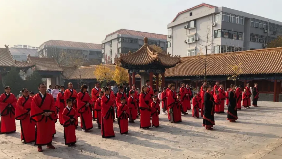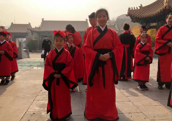 在紧张又庄严的彩排过后,活动于上午 10 点正式举行,同学们和家长们在文庙老师的带领下穿汉服,行古礼,游文庙,听儒学故事。