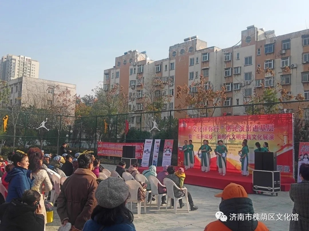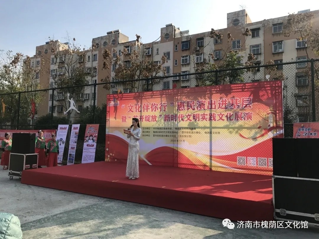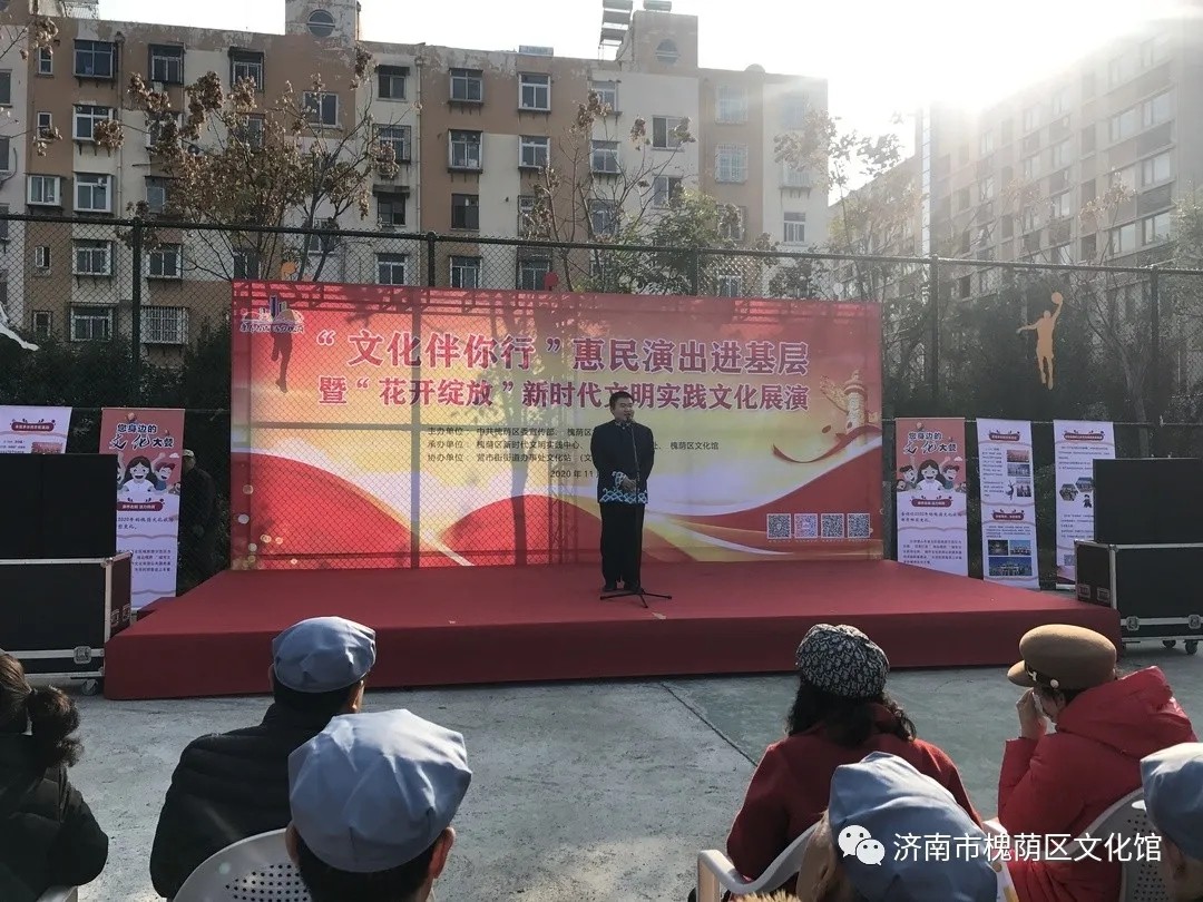 11月24日下午两点,济南市槐荫区营市街街道办事处营苑广场,由中共槐荫区委宣传部、槐荫区文化和旅游局主办,由槐荫区文明办、槐荫区营市街街道办事处、槐荫区文化馆承办的槐荫区“文化伴你行”惠民演出进基层暨“花开绽放”新时代文明实践文化展演活动在期待中拉开序幕。