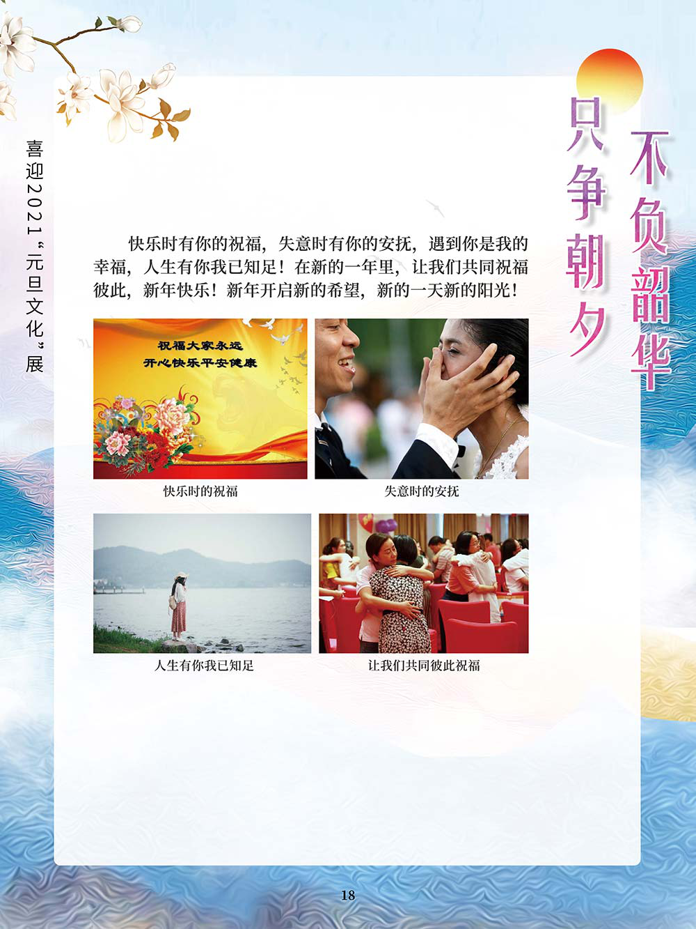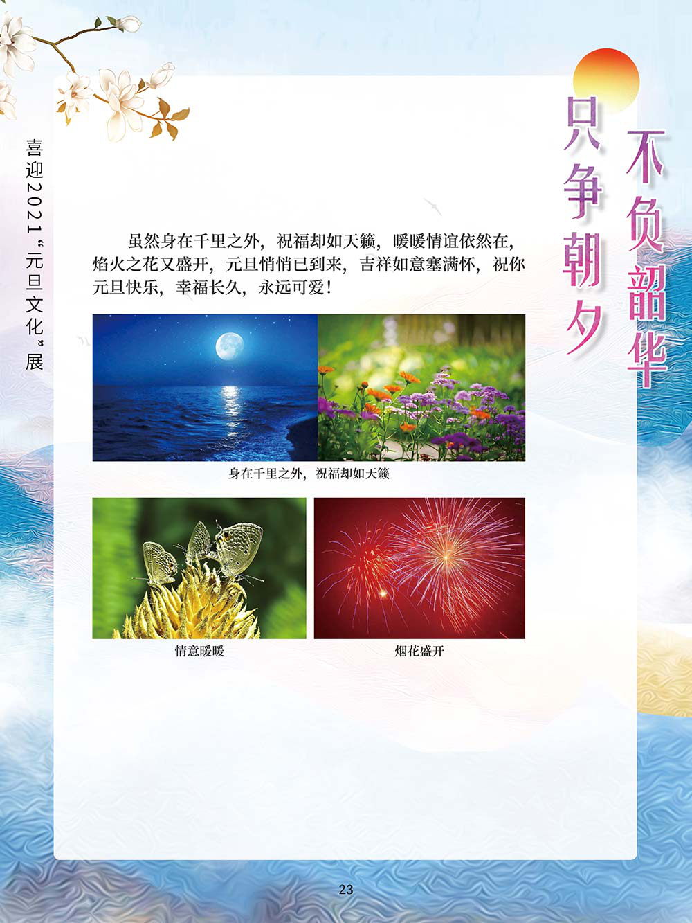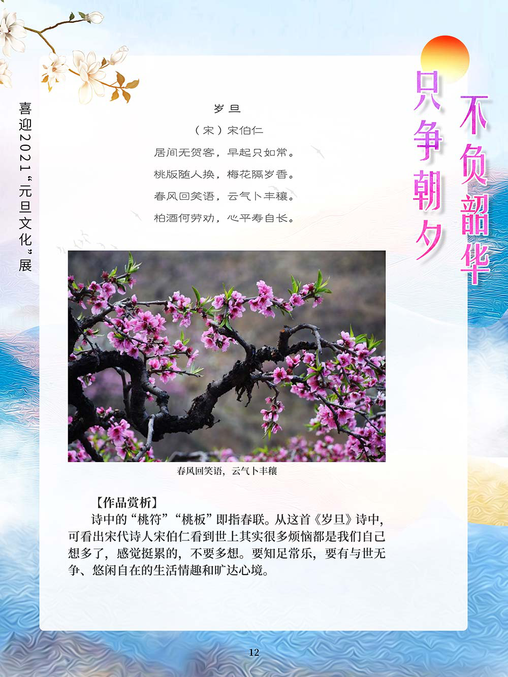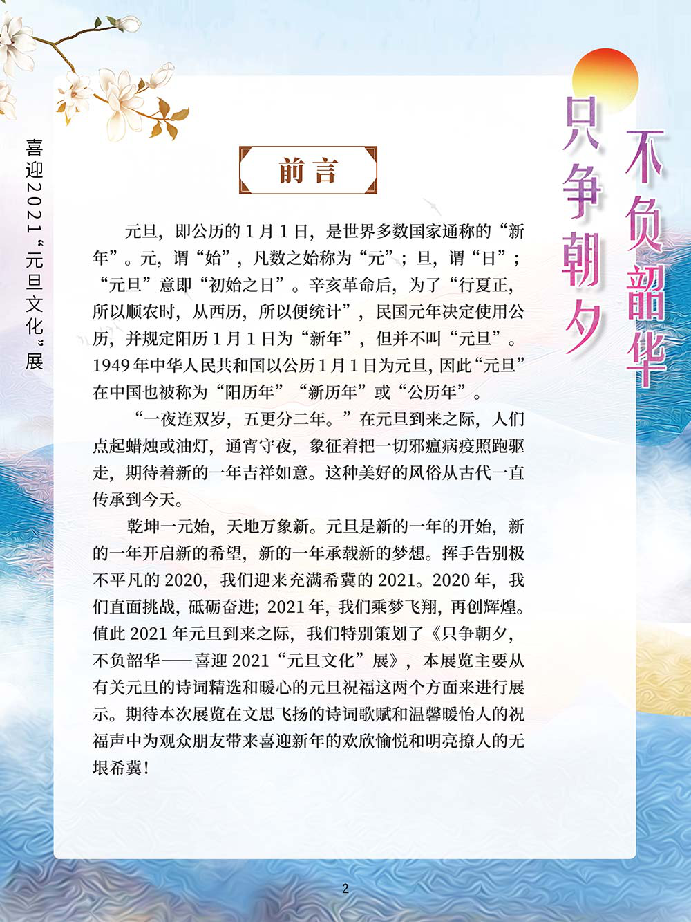 元旦,即公历的1月1日,是世界多数国家通称的“新年”。元,谓“始”,旦,谓“日”;“元旦”意即“初始之日”。1949年中华人民共和国以公历1月1日为元旦,因此“元旦”在中国也被称为“阳历年”“新历年”或“公历年”。“一夜连双岁,五更分二年。”在元旦到来之际,人们点起蜡烛或油灯,通宵守夜,象征着把一切邪瘟病疫照跑驱走,期待着新的一年吉祥如意。这种美好的风俗从古代一直传承到今天。乾坤一元始,天地万象新。元旦是新的一年的开始,新的一年开启新的希望,新的一年承载新的梦想。挥手告别极不平凡的2020,我们迎来充满希冀的2021。2020年,我们直面挑战,砥砺奋进;2021年,我们乘梦飞翔,再创辉煌。值此2021年元旦到来之际,我们特别策划了《只争朝夕 不负韶华——喜迎2021“元旦文化”展》,本展览主要从元旦的诗词精选和暖心的元旦祝福两个方面来进行展示。期待本次展览在文思飞扬的诗词歌赋和温馨暖人的祝福声中为观众朋友带来快乐和期盼!