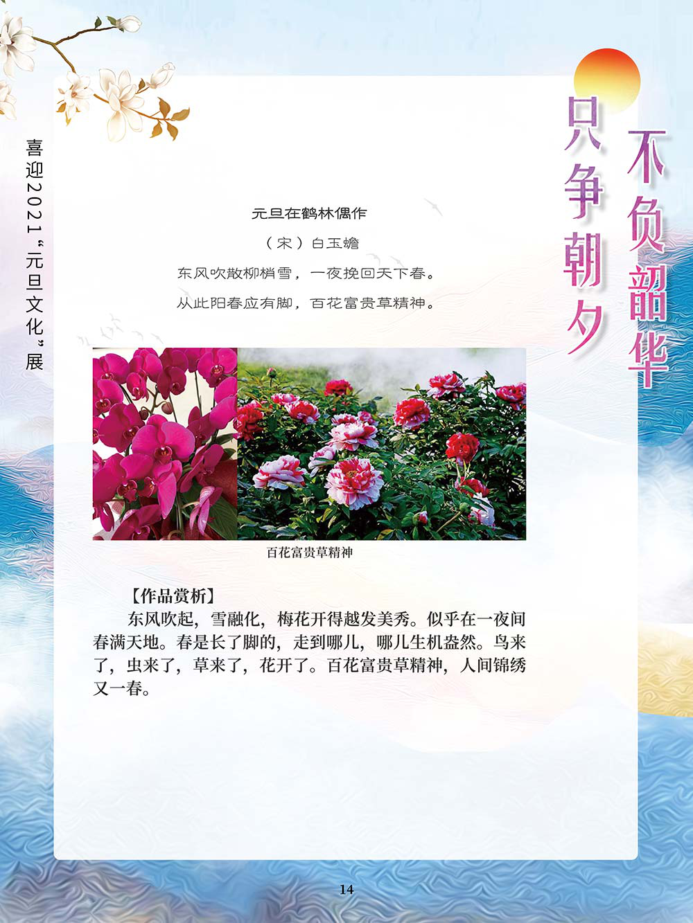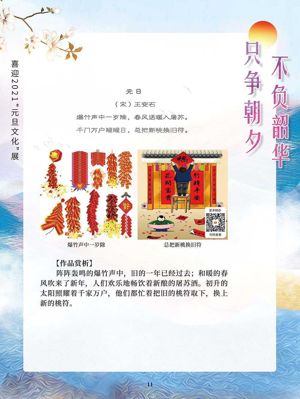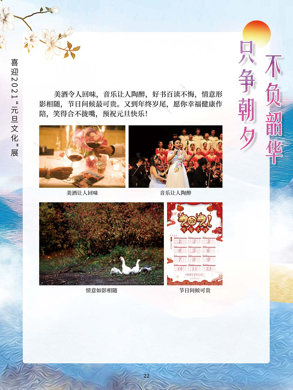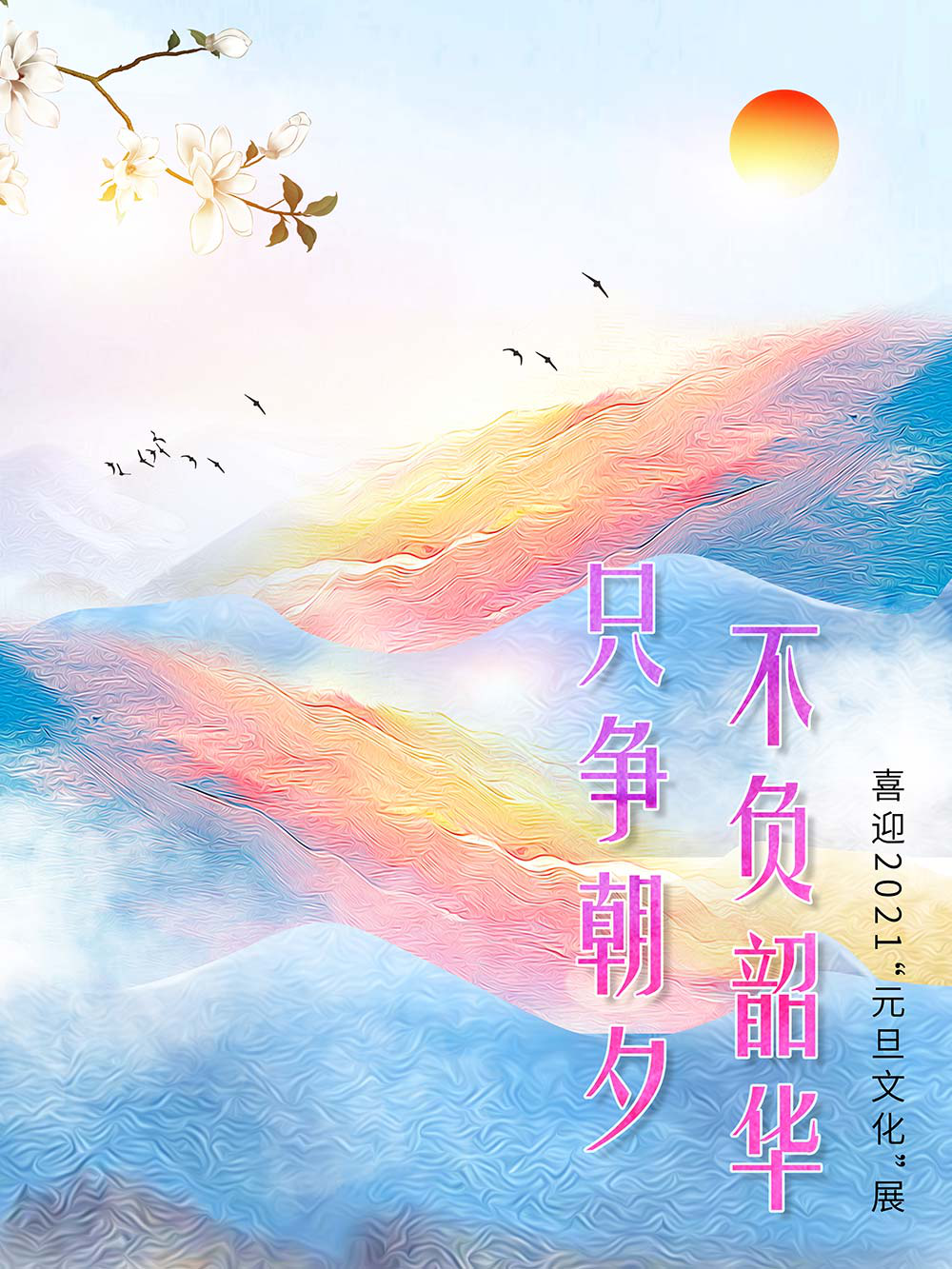 元旦,即公历的1月1日,是世界多数国家通称的“新年”。元,谓“始”,旦,谓“日”;“元旦”意即“初始之日”。1949年中华人民共和国以公历1月1日为元旦,因此“元旦”在中国也被称为“阳历年”“新历年”或“公历年”。“一夜连双岁,五更分二年。”在元旦到来之际,人们点起蜡烛或油灯,通宵守夜,象征着把一切邪瘟病疫照跑驱走,期待着新的一年吉祥如意。这种美好的风俗从古代一直传承到今天。乾坤一元始,天地万象新。元旦是新的一年的开始,新的一年开启新的希望,新的一年承载新的梦想。挥手告别极不平凡的2020,我们迎来充满希冀的2021。2020年,我们直面挑战,砥砺奋进;2021年,我们乘梦飞翔,再创辉煌。值此2021年元旦到来之际,我们特别策划了《只争朝夕 不负韶华——喜迎2021“元旦文化”展》,本展览主要从元旦的诗词精选和暖心的元旦祝福两个方面来进行展示。期待本次展览在文思飞扬的诗词歌赋和温馨暖人的祝福声中为观众朋友带来快乐和期盼!