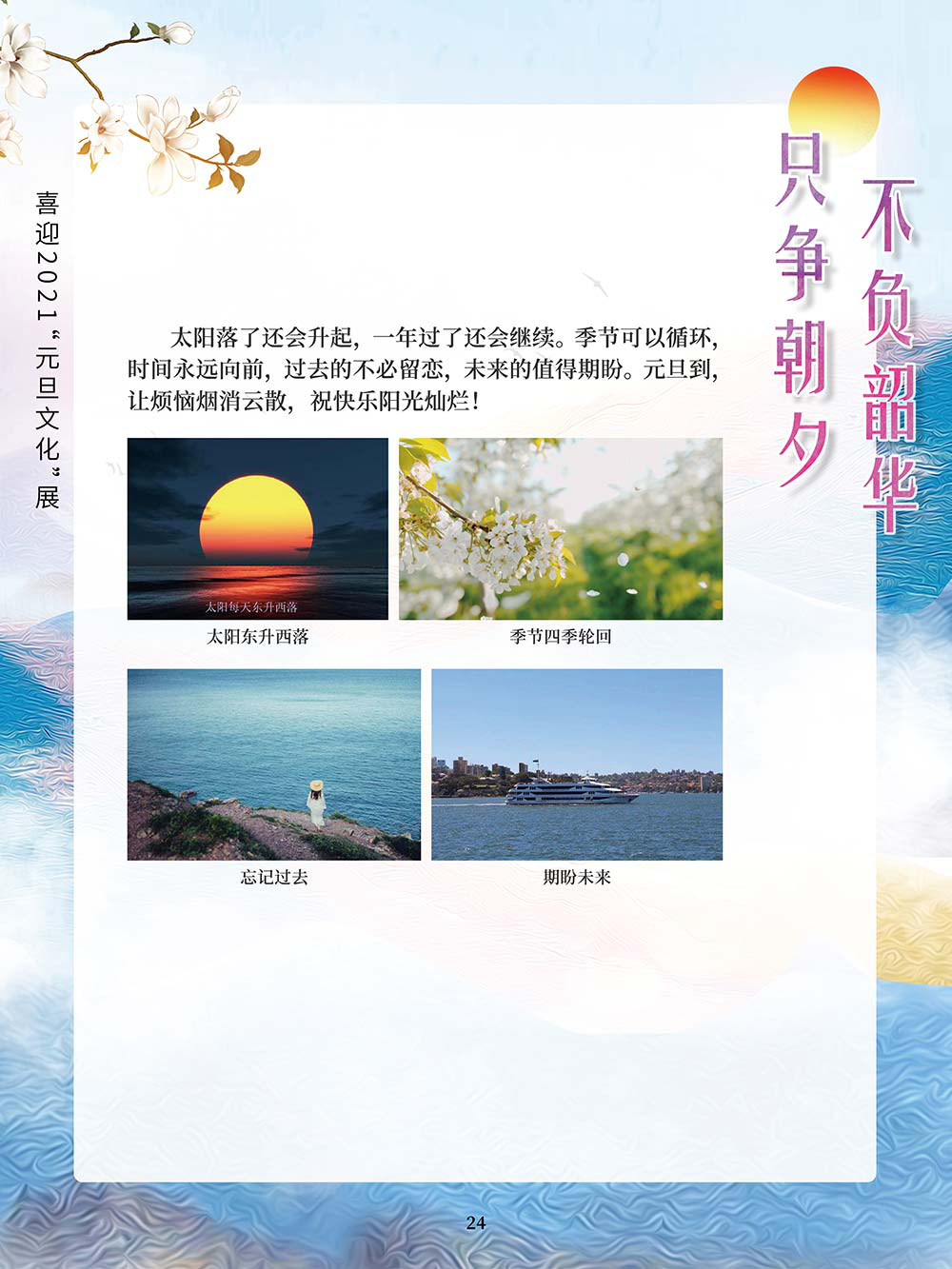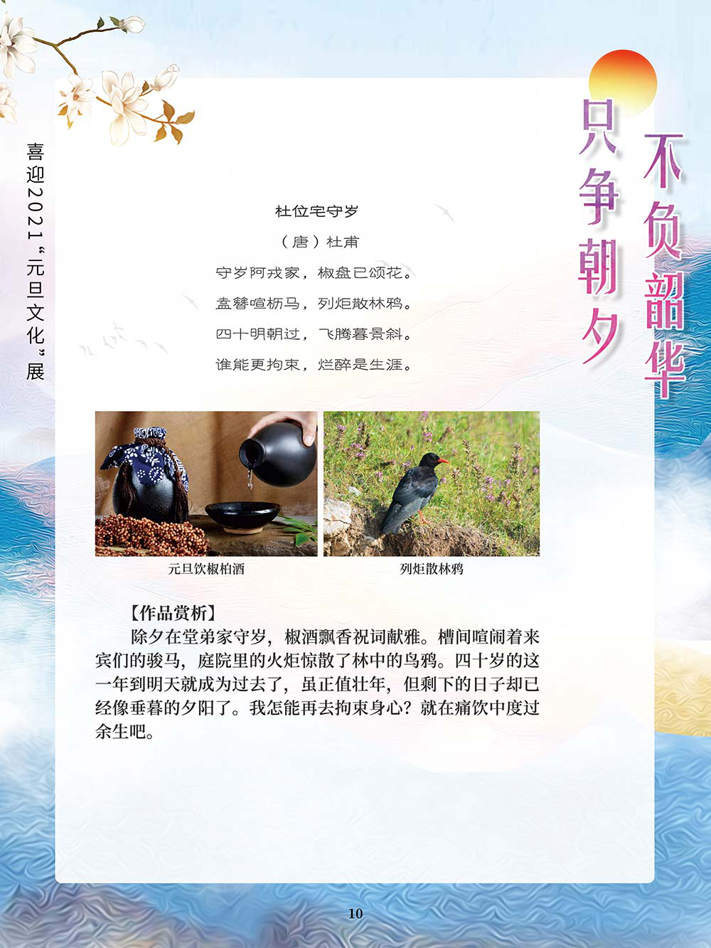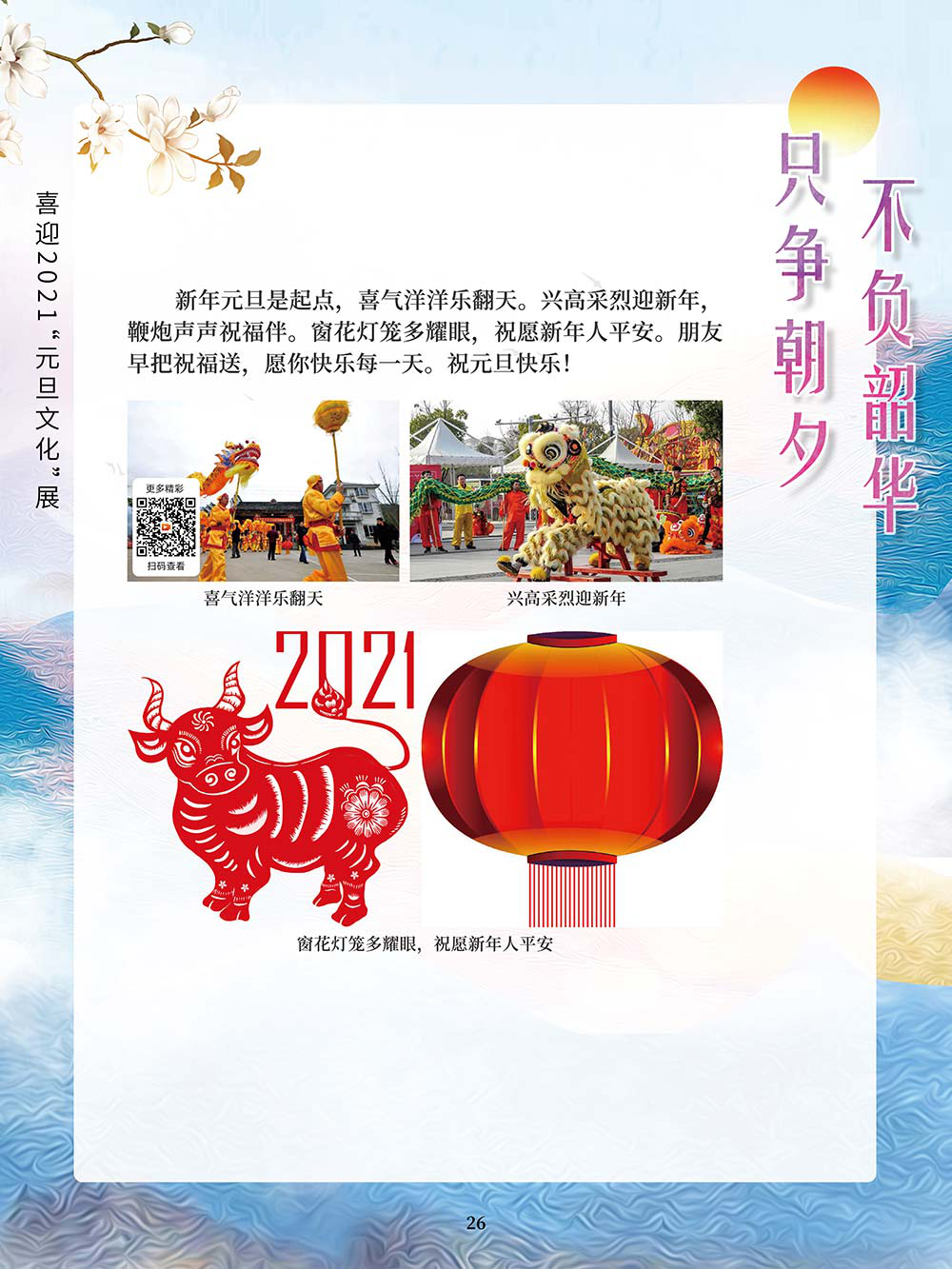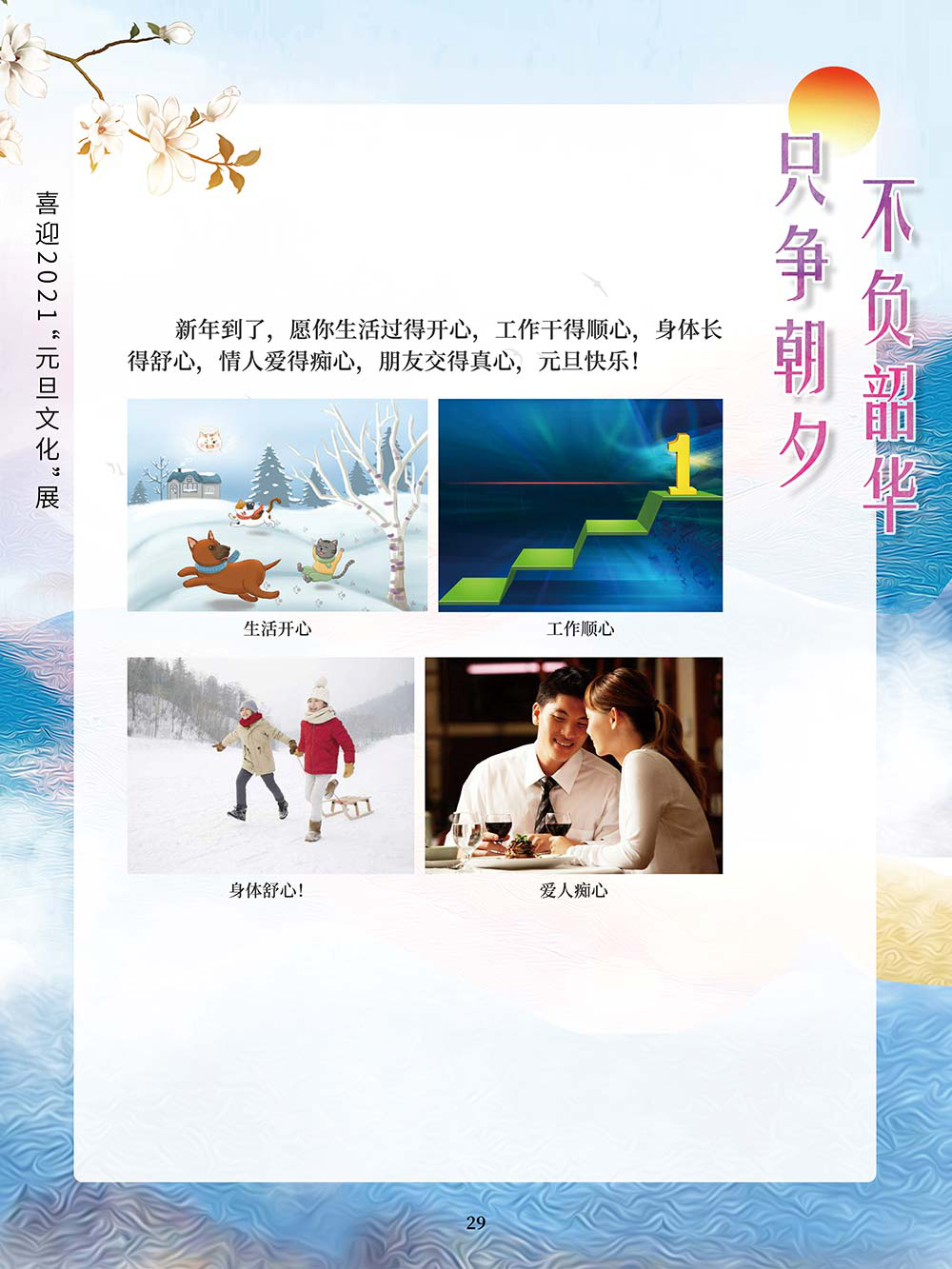 元旦,即公历的1月1日,是世界多数国家通称的“新年”。元,谓“始”,旦,谓“日”;“元旦”意即“初始之日”。1949年中华人民共和国以公历1月1日为元旦,因此“元旦”在中国也被称为“阳历年”“新历年”或“公历年”。“一夜连双岁,五更分二年。”在元旦到来之际,人们点起蜡烛或油灯,通宵守夜,象征着把一切邪瘟病疫照跑驱走,期待着新的一年吉祥如意。这种美好的风俗从古代一直传承到今天。乾坤一元始,天地万象新。元旦是新的一年的开始,新的一年开启新的希望,新的一年承载新的梦想。挥手告别极不平凡的2020,我们迎来充满希冀的2021。2020年,我们直面挑战,砥砺奋进;2021年,我们乘梦飞翔,再创辉煌。值此2021年元旦到来之际,我们特别策划了《只争朝夕 不负韶华——喜迎2021“元旦文化”展》,本展览主要从元旦的诗词精选和暖心的元旦祝福两个方面来进行展示。期待本次展览在文思飞扬的诗词歌赋和温馨暖人的祝福声中为观众朋友带来快乐和期盼!