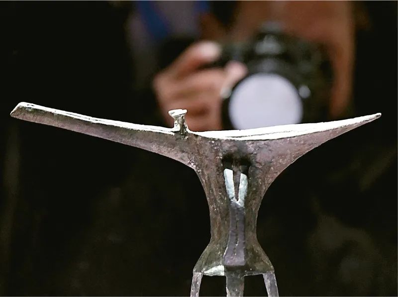 二里头遗址位于河南省洛阳市偃师二里头村,距今约3800—3500年。历经几代人的不懈探索,目前二里头遗址发现了中国最早的“紫禁城”、最早的城市主干道网、最早的青铜礼器群及铸铜作坊、最早的双轮车辙……成为寻找夏代最重要的一把钥匙。图为2019年10月19日,参观者在二里头夏都遗址博物馆内拍摄展品“乳钉纹铜爵”。新华社记者 李安/摄