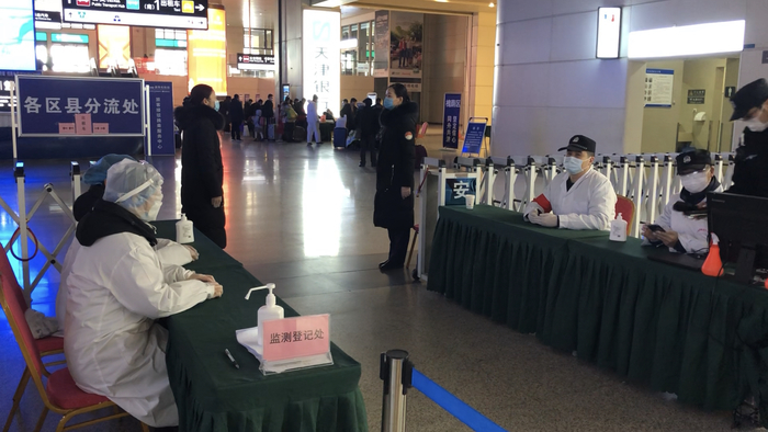 旅客乘坐高铁到站后,出站前需完成检测分流,彩虹岗志愿服务队服务于出站前的四个步骤。第一,检测体温,由专门的红外线体温检测仪智能测温。“有些乘客可能跑步出汗了,第一次测温不太正常,等他稳定一会儿,再次测量,如果还是高温的话,有一个专门的隔离屋隔离。”第二步,体温检测完毕后,出示身份证核验个人信息。第三步,工作人员询问去处进行分离。最后一步在各个区县分离点登记。