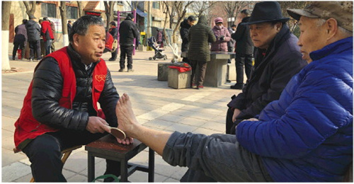 1月19日上午11点,阳光正好。在济南市槐荫区张庄路街道明星社区的小广场上,穿着红色马夹的刘跃正熟练地帮老人修脚:剪趾甲、去死皮、刮老茧、按摩……这位银发老人的手艺一点儿也不比修脚店里的师傅差。刘跃今年69岁,是一名有着38年党龄的退休教师,已经义务为老人修脚10多年。这些年,他去过济南30多家老年公寓,义务服务老人上万人次。