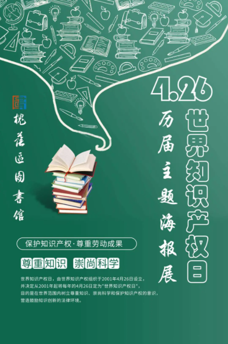 世界知识产权组织将每年的4月26日定为"世界知识产权日",目的是在世界范围内树立尊重知识、崇尚科学和保护知识产权的意识,营造鼓励知识创新的法律环境。4月22日—4月30日期间,槐荫区图书馆在二楼休闲吧举办“世界知识产权日历届主题海报”展览活动,旨在帮助人们了解知识产权在鼓励创新创造方面的重要作用,欢迎读者前来观展。