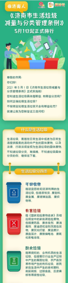 《济南市生活垃圾减量与分类管理条例》以及《〈济南市生活垃圾减量与分类管理条例〉实施方案》已于2021年5月1日起正式施行。