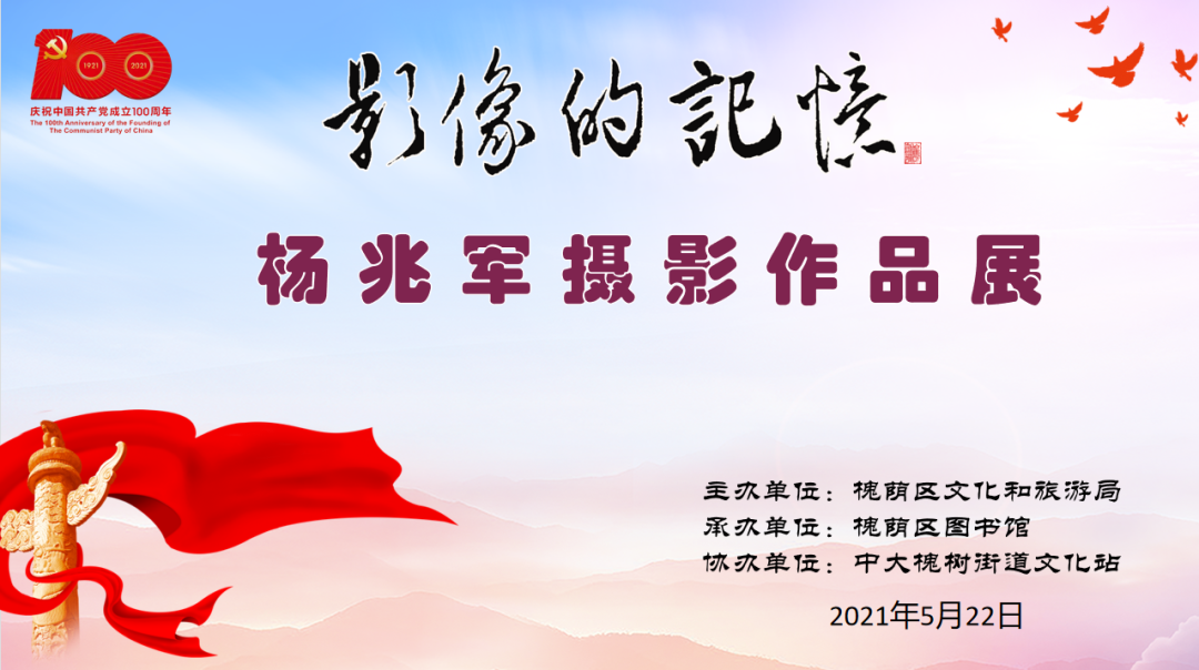 为庆祝中国共产党建党 100 周年,槐荫区图书馆特举办“影像的记忆”——献礼建党 100 周年,杨兆军摄影作品展活动。本次展览由杨兆军先生在不同时期、不同角度拍摄的近 80 幅精美摄影作品组成,通过摄影作品感受到建党一百周年以来祖国的变化,感受日新月异的沧桑巨变带给我们的感动和震撼!