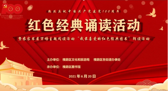 为庆祝中国共产党成立100周年,贯彻落实党史学习教育,深入推进新时代党的建设新的伟大工程,营造良好的阅读氛围,向中国共产党百年华诞献礼。由槐荫区文化和旅游局、槐荫区各街道办事处主办,槐荫区图书馆承办的“庆建党百年红色经典诵读活动暨农家书屋万场主题阅读活动‘我最喜爱的红色经典图书’朗读活动”将于6月20日14:00在槐荫区图书馆六楼多功能厅举行。