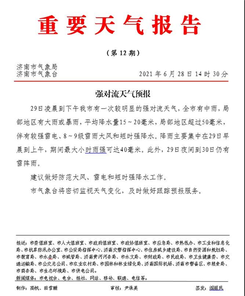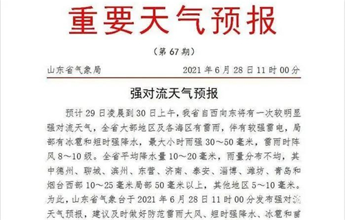 济阳区 雷阵雨转多云 南风3~4级,雷雨时阵风8级 气温24~34℃