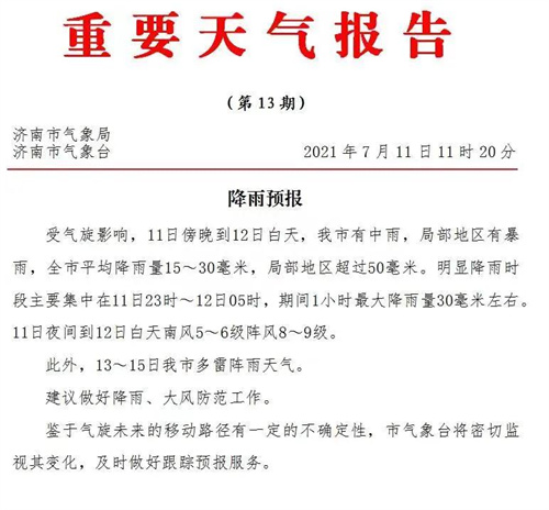 此外,13~15日济南市多雷阵雨天气。建议做好降雨、大风防范工作。