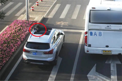 4月28日17时许,济南交警历下大队指挥中心发现,一辆SUV在行驶过程中,车上的儿童将身体伸出车辆天窗外,非常危险。