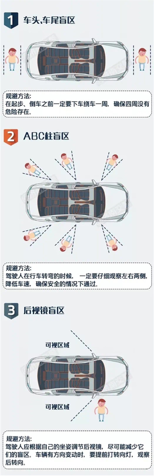 汽车有盲区,你我要远离。对于家长而言,要教会孩子认知车辆的盲区。更不能让孩子在车辆周围玩耍、逗留;对于驾驶人而言,开车前要多检查、行车时要多留意。