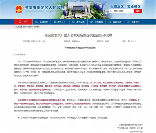 为进一步做好疫情防控和疫苗接种工作,区委统筹疫情防控和经济运行工作领导小组决定,自7月13日起,将在全区机关企事业单位、交通场站、商场超市、宾馆饭店、停车场地、影院剧院、景区景点、医疗机构、养老机构、救助机构、福利机构、公共洗浴、美容理发、歌厅网吧、游戏娱乐等公共场所及乘坐公交车、出租车时,查验新冠病毒疫苗接种信息。广大居民出入以上公共场所时,需准确提供本人疫苗接种信息,未接种人员须登记个人信息,严格落实各项防护要求,并尽快完成接种,请广大市民予以理解配合。