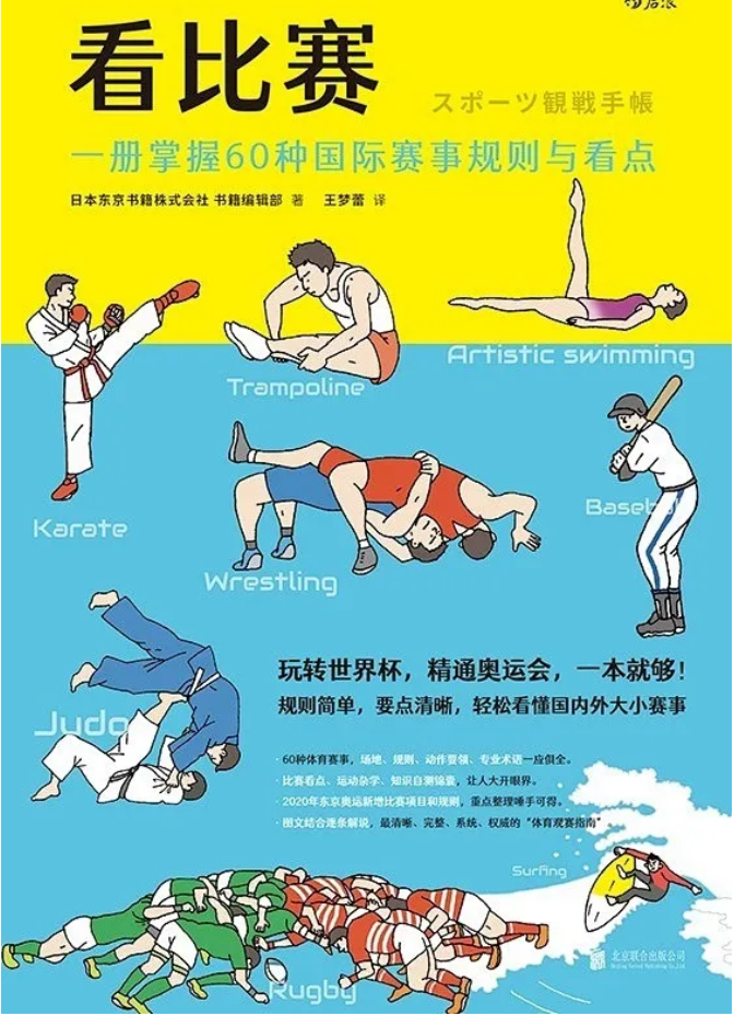 由日本东京书籍株式会社书籍编辑部编著的《看比赛》一书中,详细介绍了60种体育赛事,场地、规则、动作要领、专业术语一应俱全。不管是热门的足球、篮球、乒乓球、体操等项目,还是首次在东京奥运会登场的攀岩、空手道、滑板、冲浪等运动,本书全一网打尽。比赛场地、项目种类、记分标准、犯规行为、动作要领、主要招式、国际体育用语……你所能想到的关于体育的一切,这本书都为你一一解答。