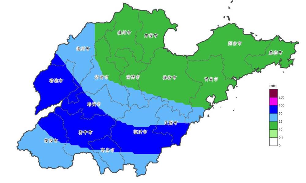 其中,聊城、菏泽、济宁、泰安、枣庄、临沂和日照南部有大雨到暴雨(30~70毫米),德州和济南有中到大雨局部暴雨(15~30毫米,局部50毫米以上),其他地区有小到中雨局部大雨(5~10毫米,局部25~50毫米)。