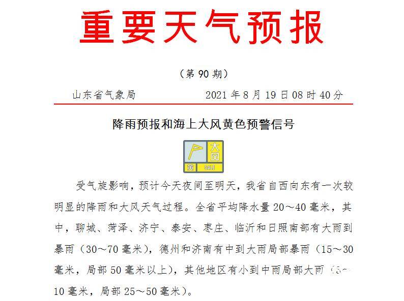 为此,山东省气象台于2021年8月19日08时40分发布海上大风黄色预警信号。