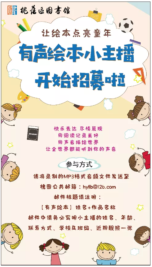 亲爱的小读者们,无论你的声音是字正腔圆、软萌甜美、还是神秘沙哑、磁性动听,请大声勇敢的show出来,我们期待听到你的声音!请录制一段完整的绘本朗读音频,发送邮件(包括个人照片、自我介绍、绘本封面照片、绘本简介、音频作品)至槐图邮箱:hylib@126.com。