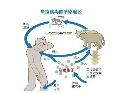 接触病畜和污染的皮、毛、肉等畜产品可感染皮肤炭疽。接触皮毛或灰尘时吸入炭疽杆菌的芽孢可感染肺炭疽。食用未经充分烹饪熟透的带炭疽杆菌的肉食和被炭疽杆菌污染的其他食物和饮用水,可感染肠炭疽。