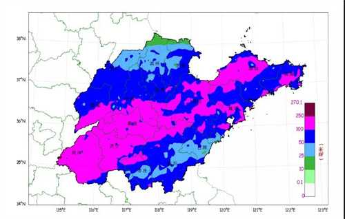 山东省气象局降水数据显示,28日20时至9月1日16时,全省平均降水量94.2(毫米,下同),折合水量约147.9亿方。各市平均:泰安148.7、菏泽140.2、济宁125.8、济南103.6、烟台98.1、淄博97.5、聊城97.2、潍坊96.6、青岛89.9、威海82.9、临沂72.9、枣庄70.3、德州59.0、东营55.3、滨州51.7、日照50.2。超过250.0的有1个站,200.0-250.0的12个,150.0-200.0的182个,100.0-150.0的567个,50.0-100.0的808个,排在前3位的是:菏泽东明长兴集270.1、淄博沂源徐家庄232.9和菏泽东明沙窝232.7。