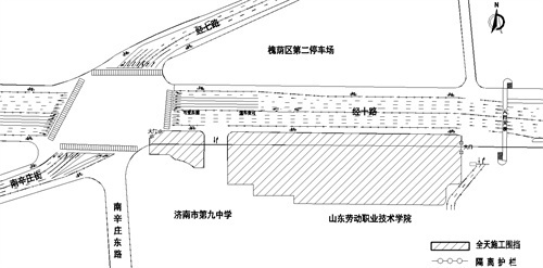 自2021年9月10日起至2023年12月31日,对经十路(经七路路口)南侧部分道路空间进行围挡施工。施工占用经十路南侧部分人行道、非机动车道、机动车道,经十路(经七路路口)东口由双向11车道改为双向10车道通行,行人及非机车道两侧通行。