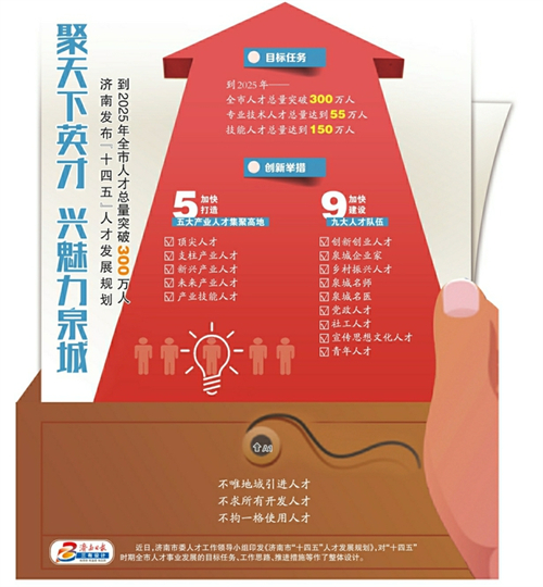 近日,济南市委人才工作领导小组印发《济南市“十四五”人才发展规划》(以下简称《规划》),《规划》共分10部分,对“十四五”时期全市人才事业发展的目标任务、工作思路、推进措施等做了整体设计。《规划》明确提出,聚焦建设黄河流域中心城市、实施强省会战略和打造“五个济南”的目标定位,强化人才引领发展地位,促进人才规模、质量和结构与经济社会发展相适应、相协调,构筑省会高质量发展的智力源泉和核心动力。