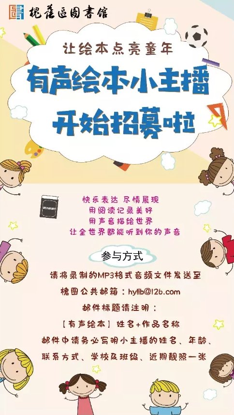 亲爱的小读者们,无论你的声音是字正腔圆、软萌甜美、还是神秘沙哑、磁性动听,请大声勇敢的show出来,我们期待听到你的声音!请录制一段完整的绘本朗读音频,发送邮件(包括个人照片、自我介绍、绘本封面照片、绘本简介、音频作品)至槐图邮箱:hylib@126.com。
