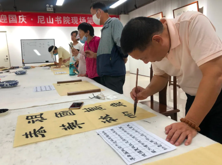 谈笑间,一幅幅苍劲有力的书法作品展现在大家面前,整个尼山书院洋溢着一派文墨气象,寄托了大家对祖国浓浓的祝福。笔会还吸引了众多书法爱好者前来观摩学习。