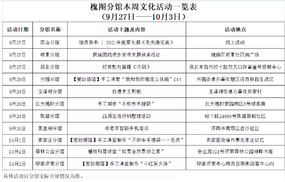 活动预告|槐荫区图书馆分馆活动预告(9月27日-10月3日)