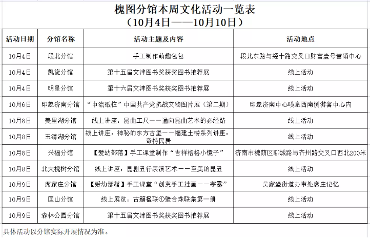 活动预告|槐荫区图书馆分馆活动预告(10月4日-10月10日)