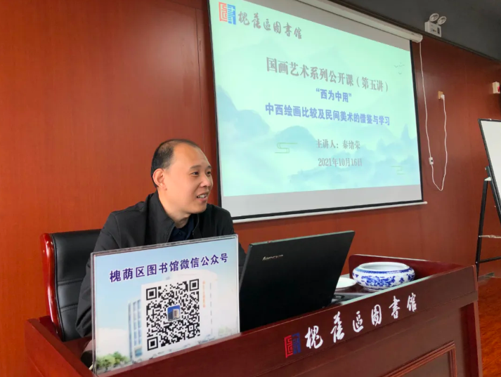 为弘扬中华民族传统文化,丰富广大读者的精神文化生活,2021年10月16日上午,槐荫区新时代文明实践中心、槐荫区图书馆特邀请青年画家秦绪荣老师来馆进行国画艺术赏析系列公益讲座第五期活动。
